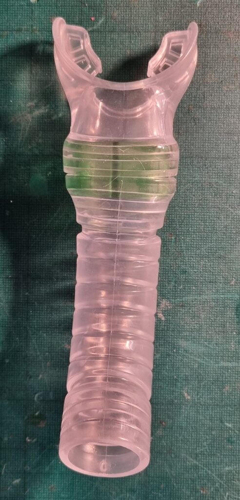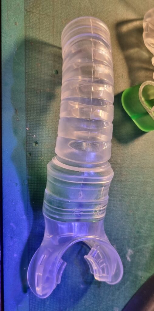 This is security-safety steel cable on knee joint. This, thin (~2mm) cable prevents reverse knee joint movement. Main (power) cable is much thicker. Fixing point in the aluminium-fiberglass composite is reinforced with extra layer of aluminium and some blind rivets. When jumping I listened to the sound of breaking steel 🙂 but aluminium was intact.