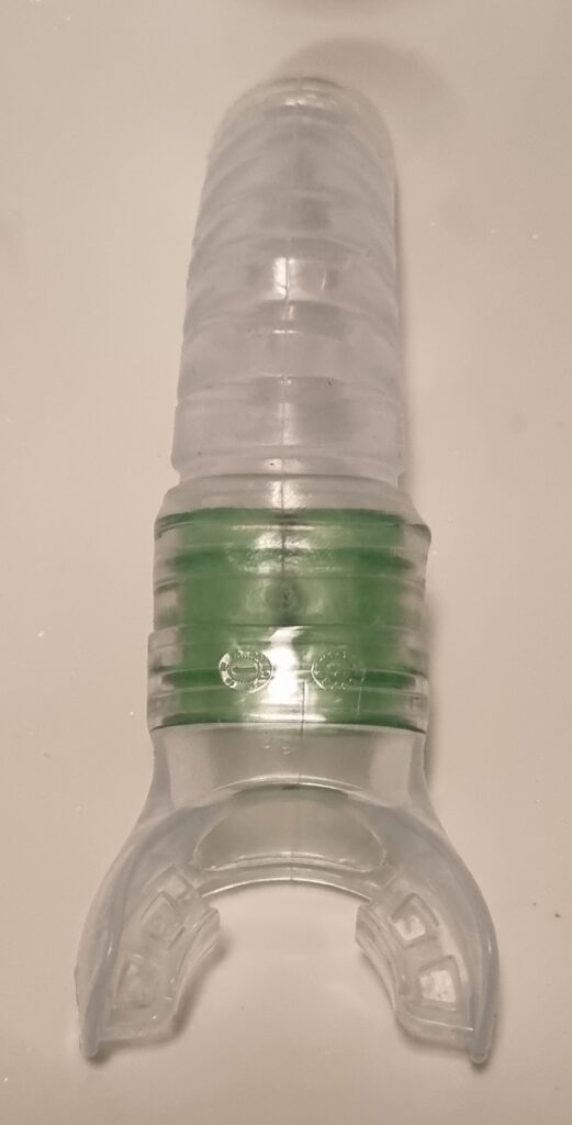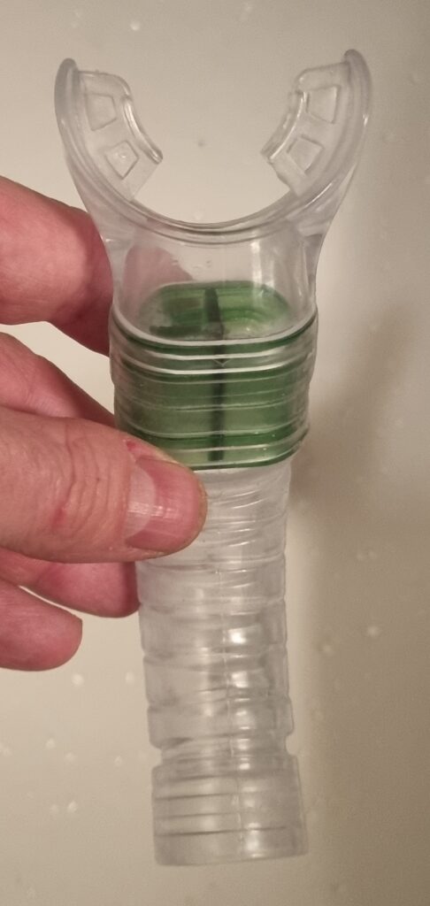 Extra nuts and washers keep Achilles joint in the centre. There is newly made “V-groove” in metal tubing. During experiments there was only thin gap exactly the size of the joint. But when I was walking it sometimes stuck and the wall of bigger steel tube was deformed.